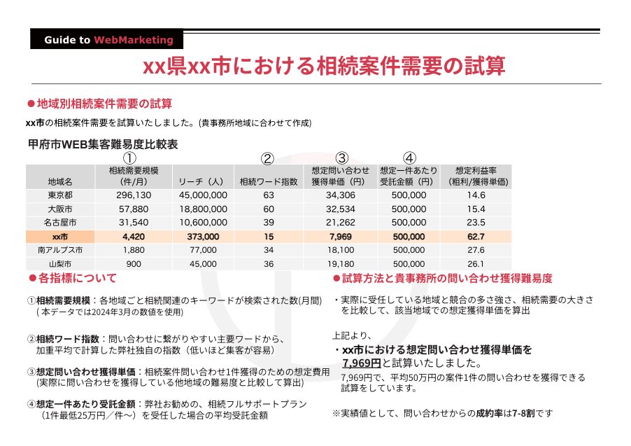 他地域と貴事務所地域の競合の強さや、需要の大きさを徹底分析